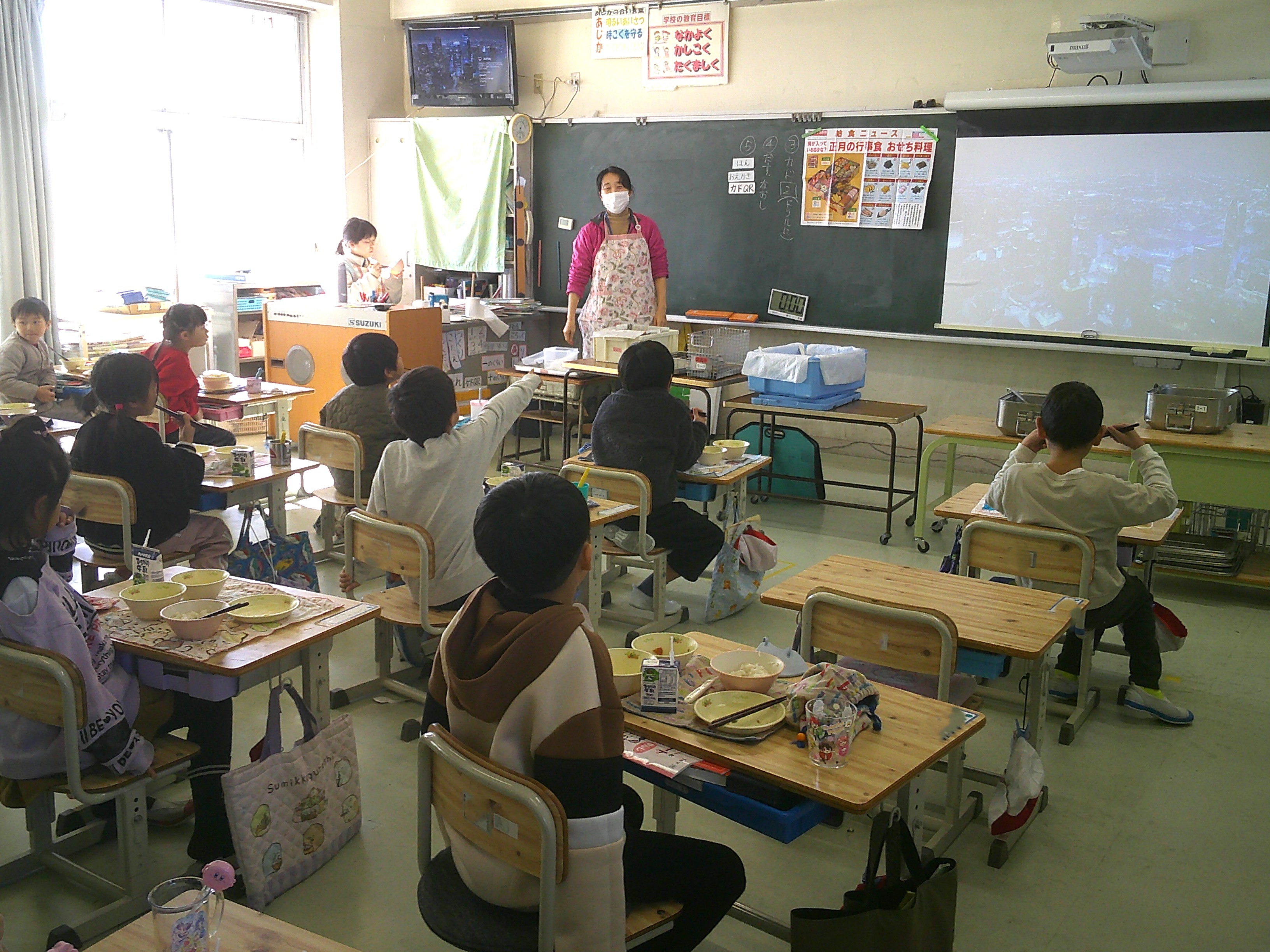 1年生が、給食時間に栄養教諭から、お正月のお料理について学びました。昼休みは、太陽が顔を出していましたが、風がとても寒かったです。それでも元気いっぱい外で遊ぶ児童の姿がありました。