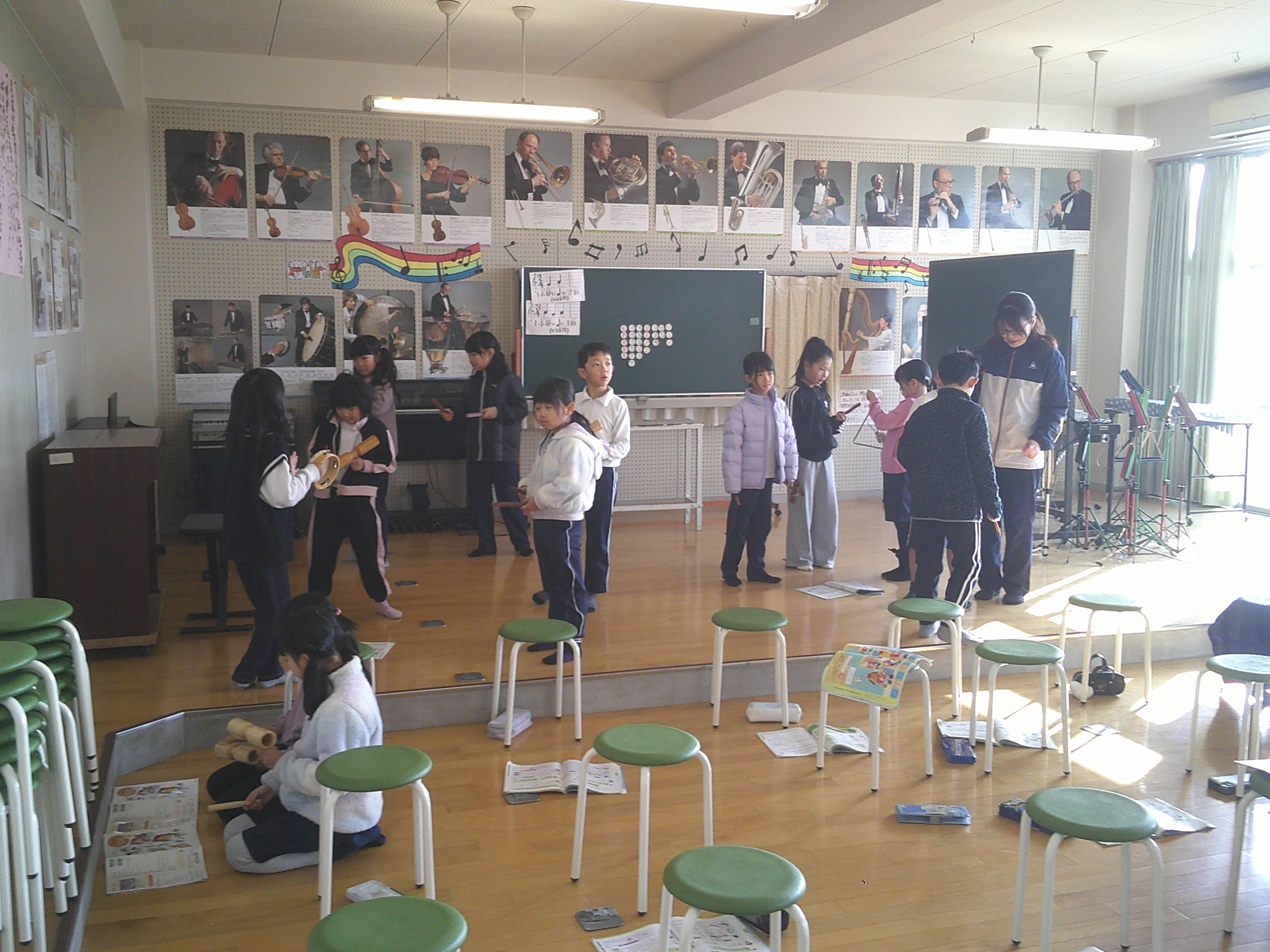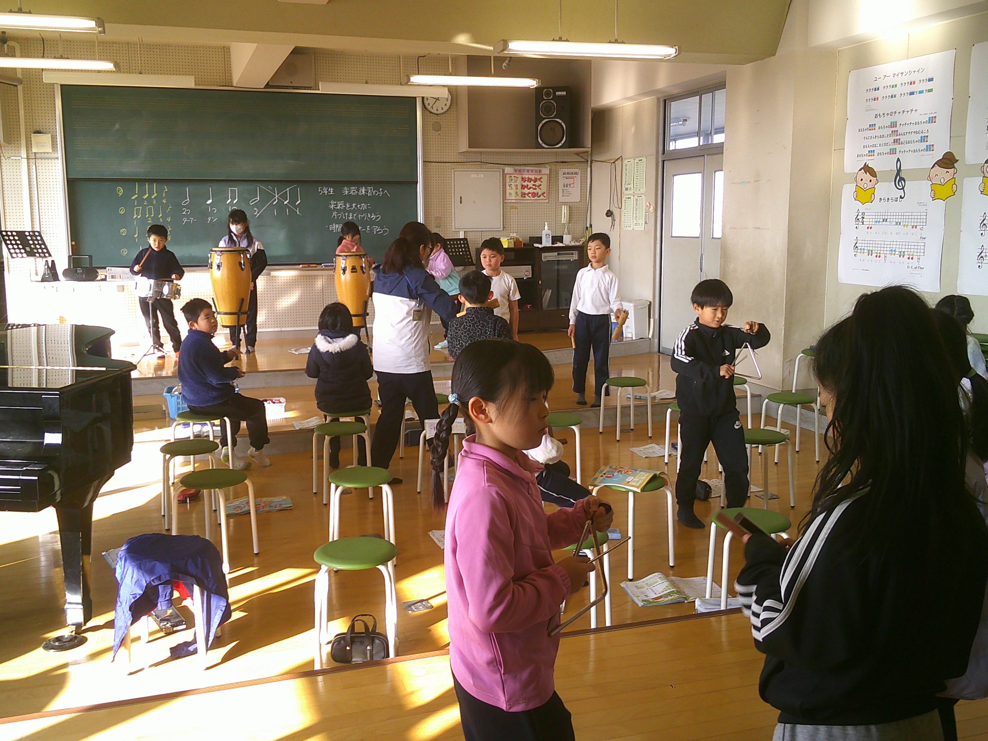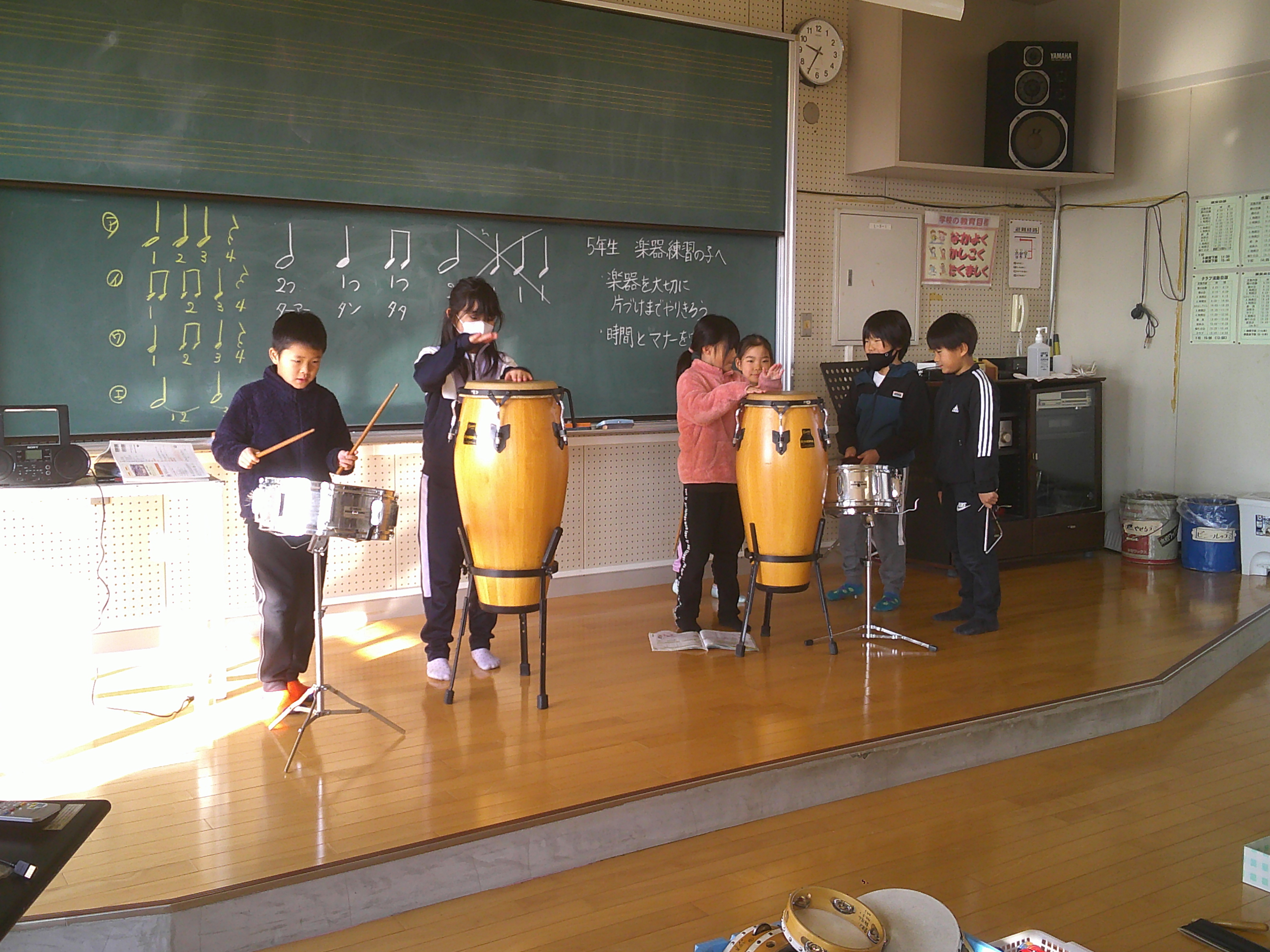 2年生が音楽でいろいろな楽器の音を重ねて演奏する学習をしました。なかよしタイム(午前中)、昼休みは、春を感じさせるあたたかな日差しでした。その昼休みに、児童に事前のアナウンスなしでの命を守る訓練(地震の発生を想定)をしました。現時点での課題が明らかになりました。