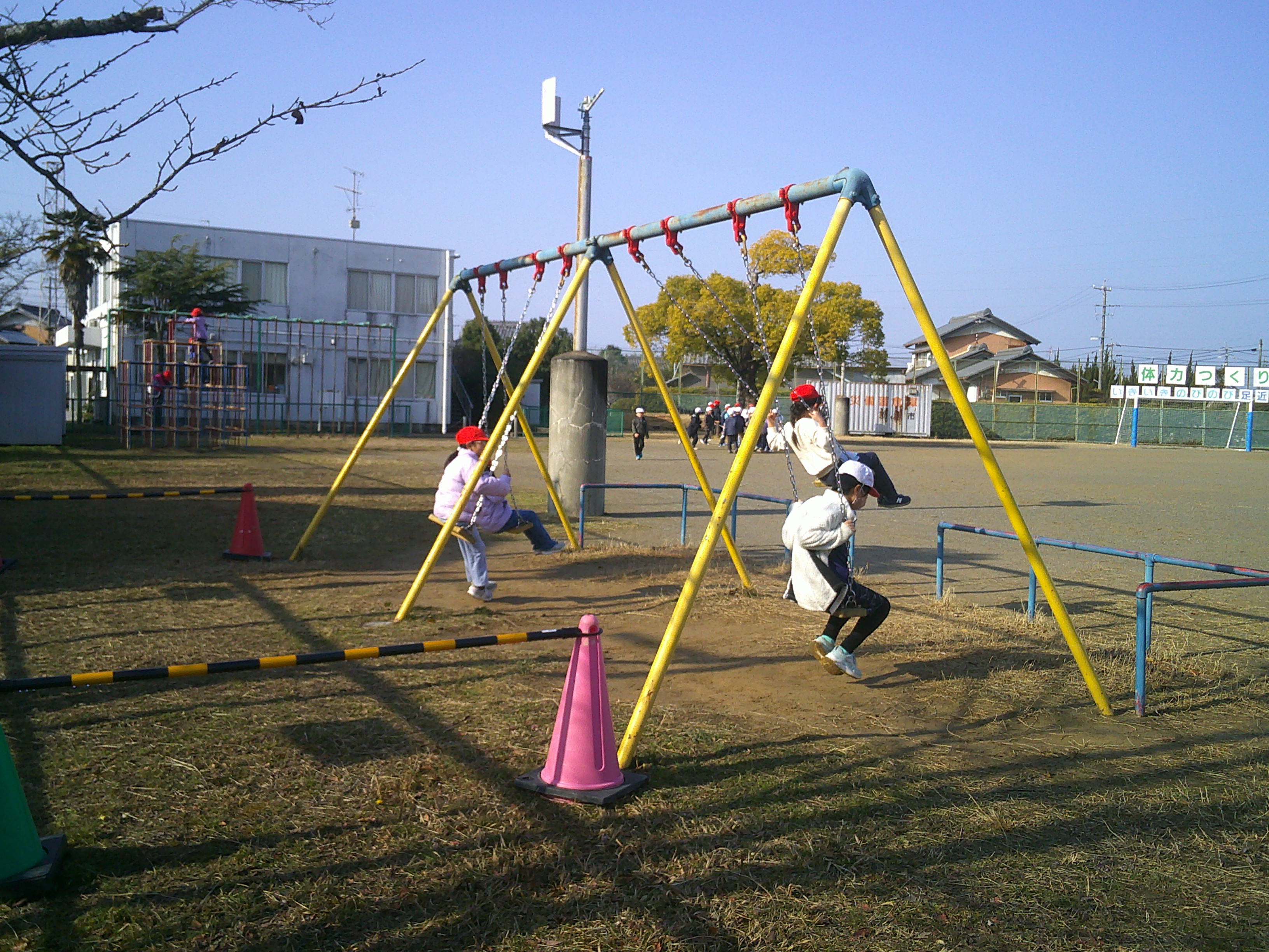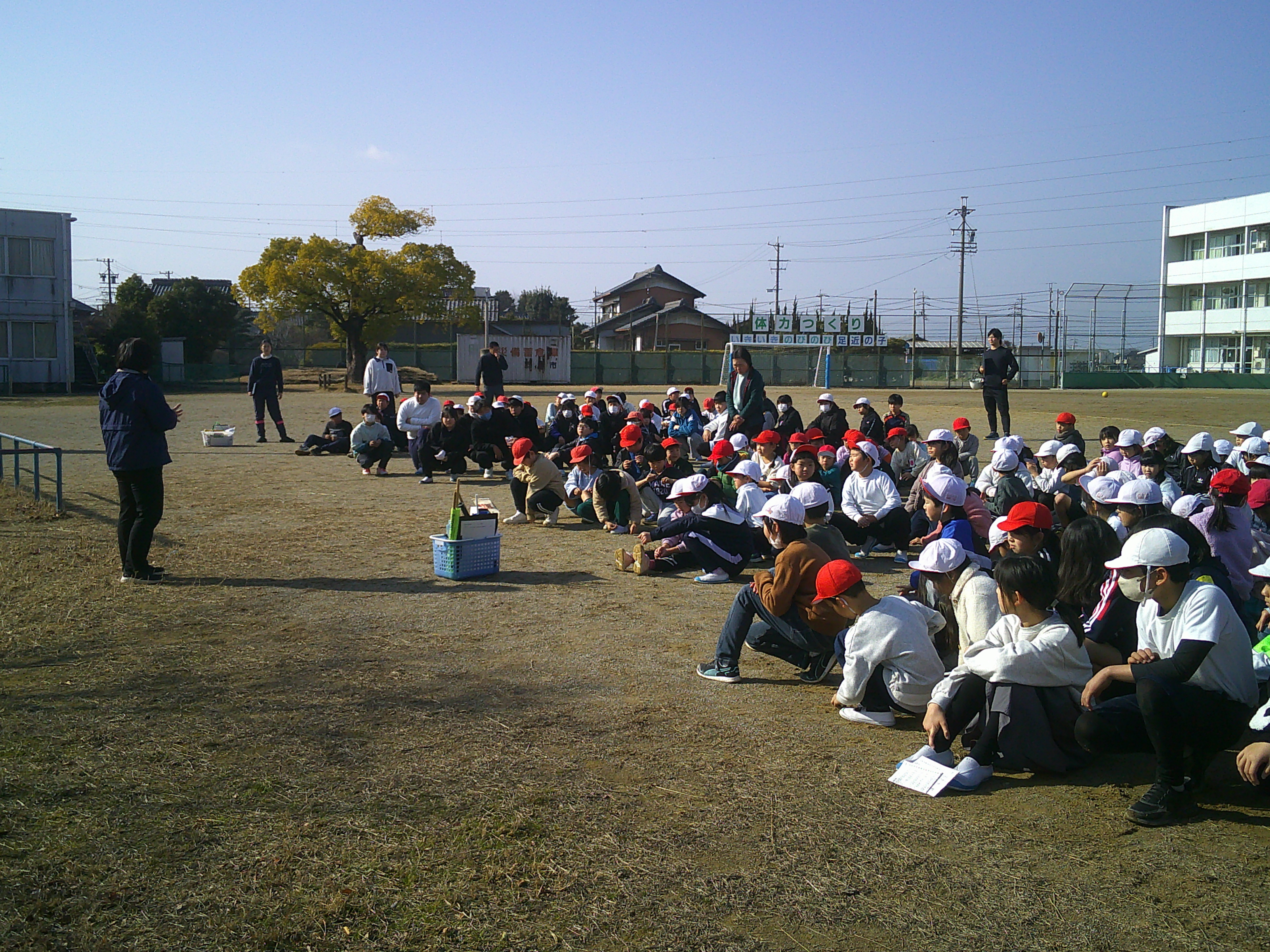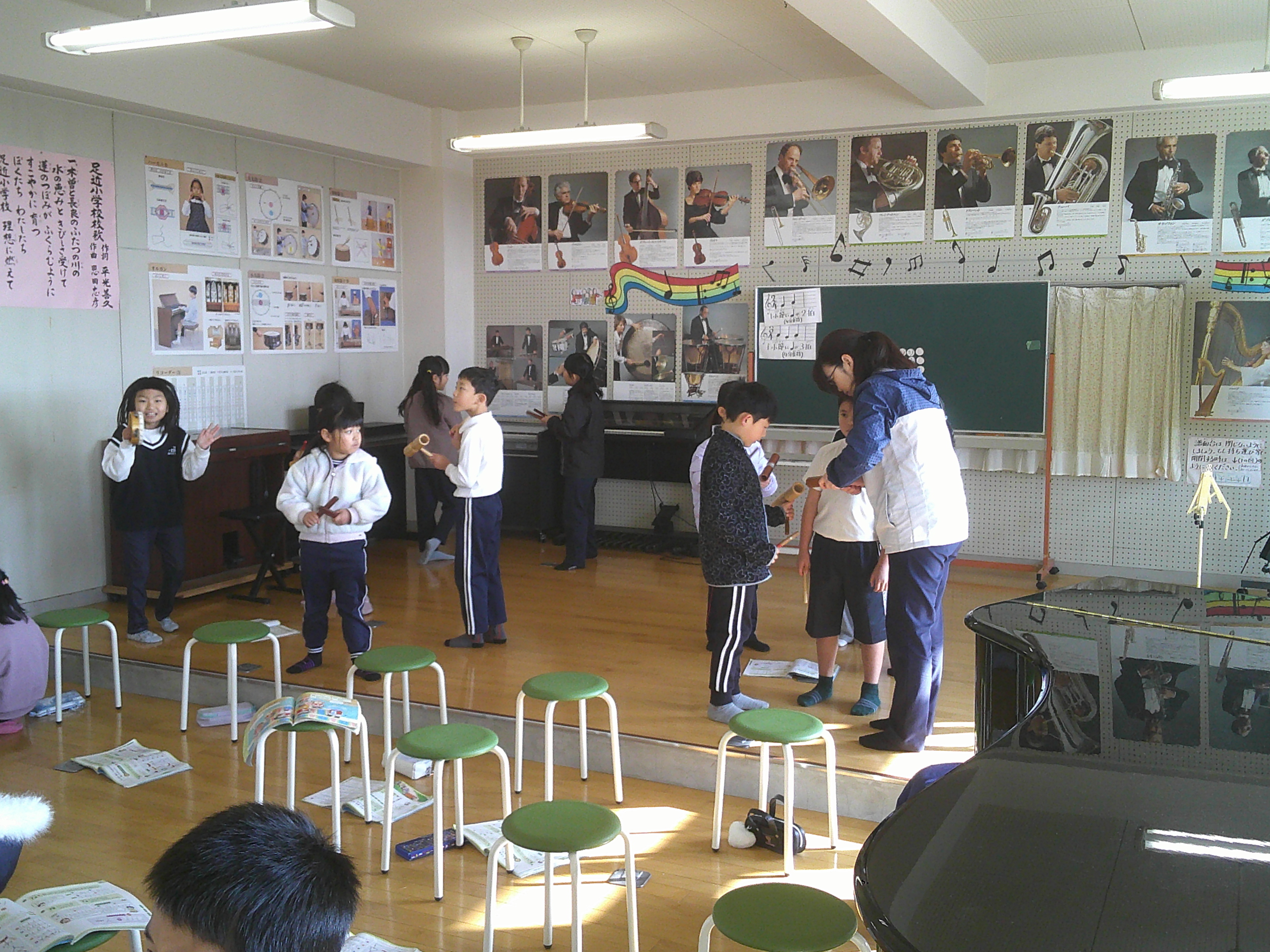 2年生が音楽でいろいろな楽器の音を重ねて演奏する学習をしました。なかよしタイム(午前中)、昼休みは、春を感じさせるあたたかな日差しでした。その昼休みに、児童に事前のアナウンスなしでの命を守る訓練(地震の発生を想定)をしました。現時点での課題が明らかになりました。
