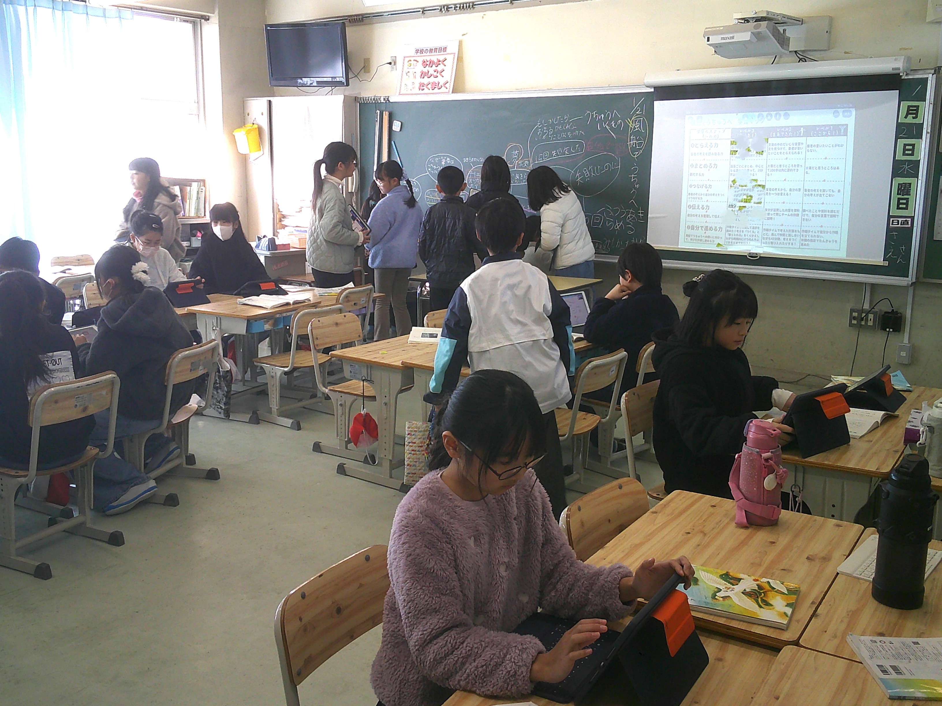 2年生が道徳「きらきら」の学習で、美しいと感じるものについて、考えたり、話し合ったりしました。4年生は国語「風船でうちゅうへ」で、興味をもったことを中心に要約して、紹介する文章を書く学習をしています。なかよしタイムは、風が冷たかったですが、チャレンジスポーツinぎふへの取組をしました。