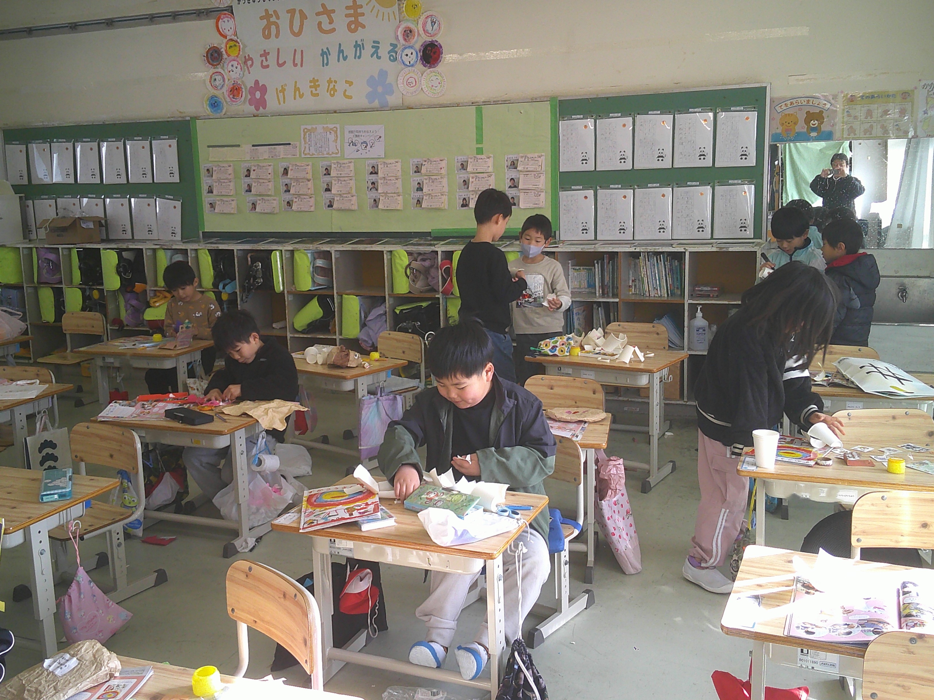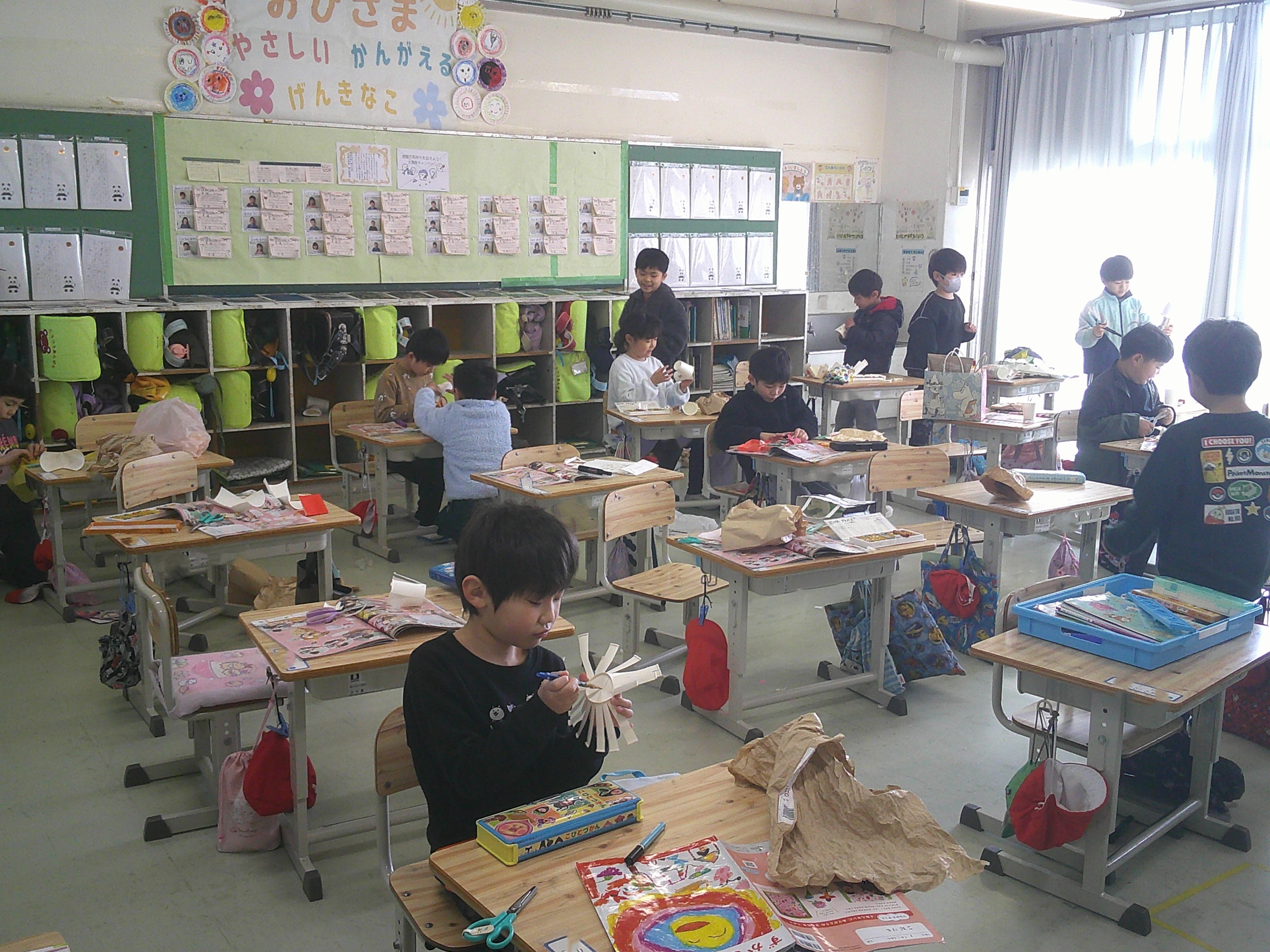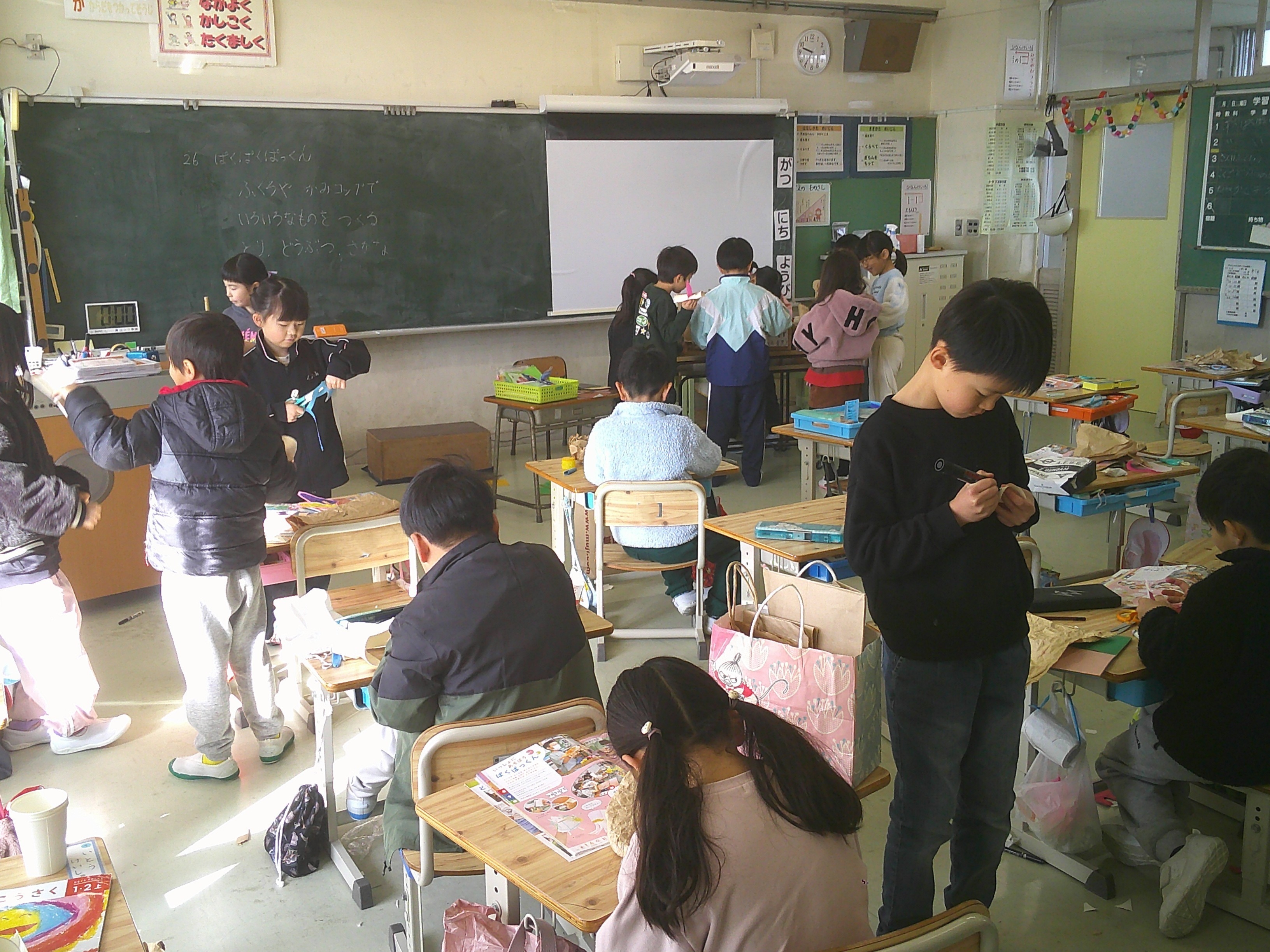 1年生が図画工作「ぱくぱっくん」の学習で、コップやふくろをぱくぱくさせて、いろいろな動きやものを夢中になってつくりました。