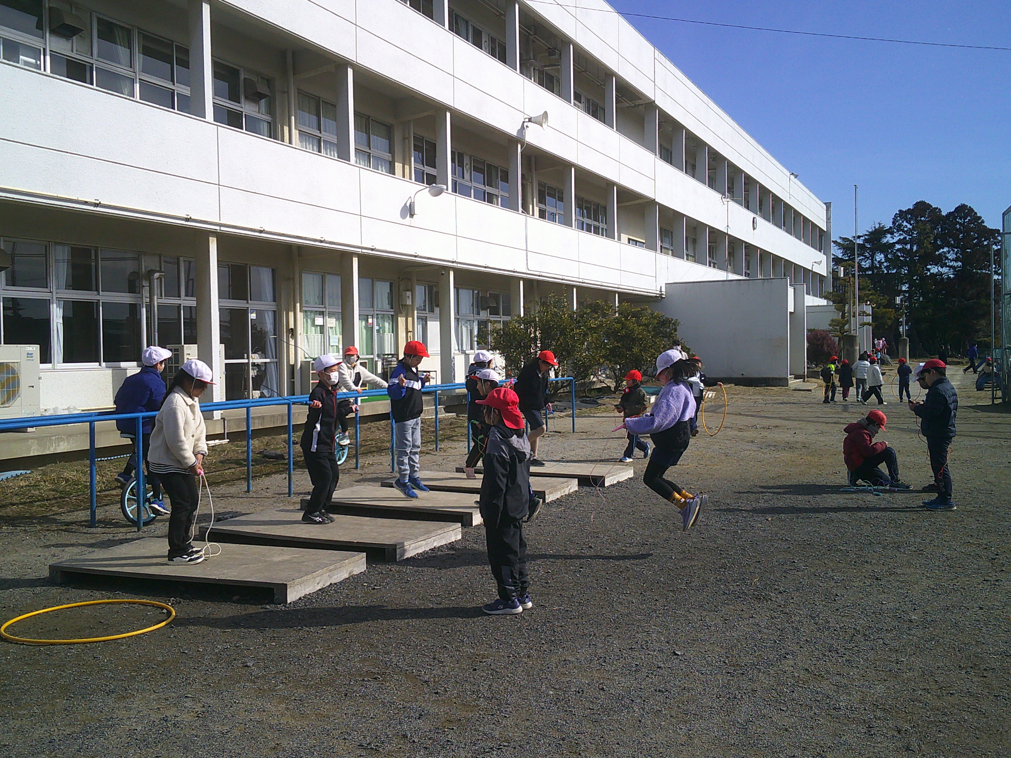 1年生が体育で跳び箱遊びを楽しみました。なかよしタイムは、それぞれ思い思いの遊びを思いっきり楽しんでいました。