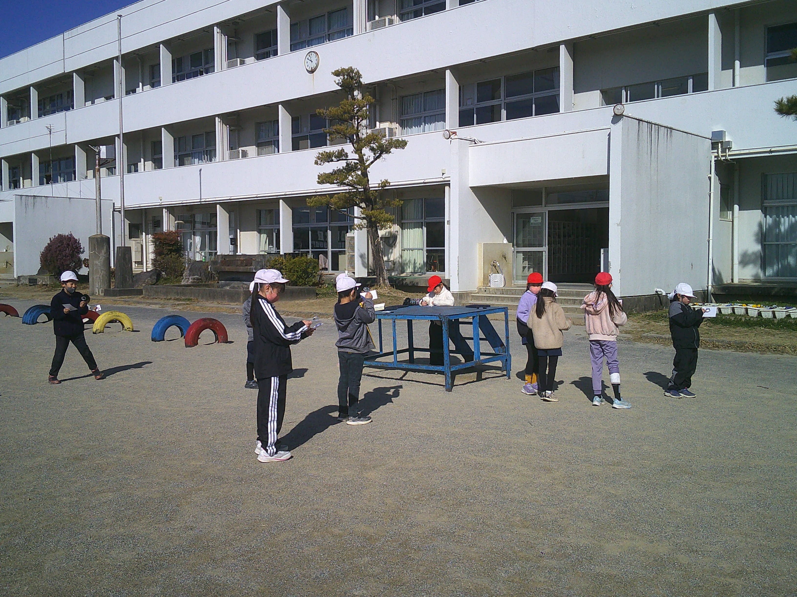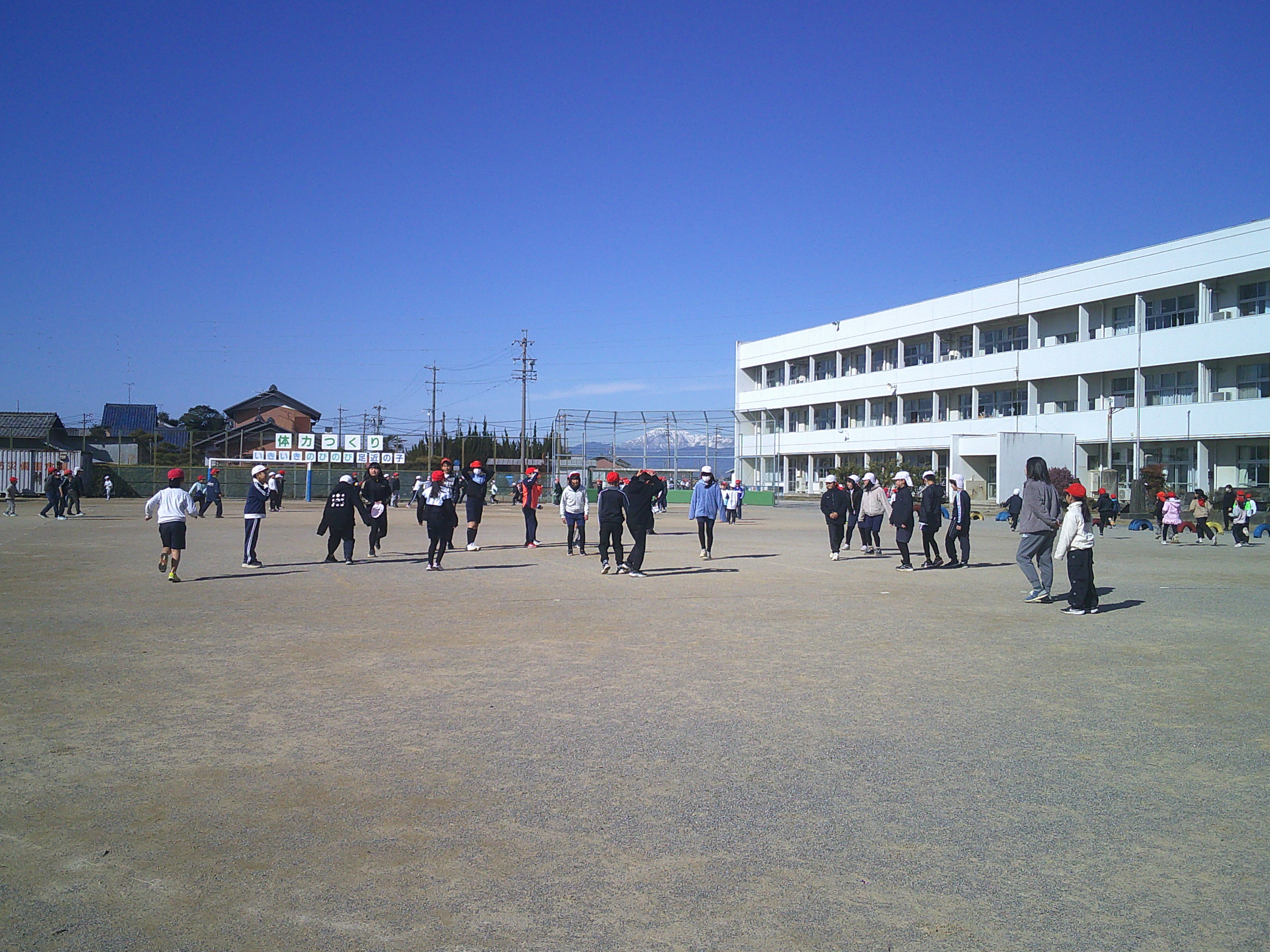 6年生が社会科「新しい日本、平和な日本へ」で、戦後、日本が復興できた背景には、どのようなことがあったのか、学習しました。3年生は理科「太陽の光」で、虫めがねで日光を集めたところの明るさやあたたかさについて調べました。この日のなかよしタイムは、風もなく、伊吹山がはっきり見えるほどの天気で、元気に遊ぶ児童の姿で、いっぱいでした。