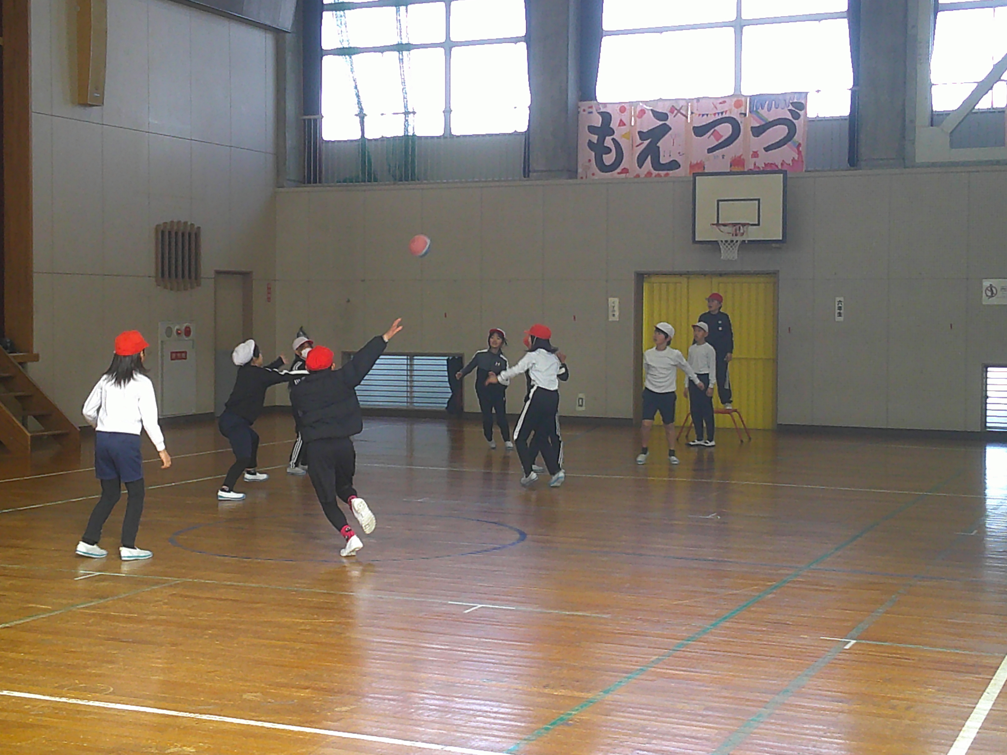 4年生が体育でポートボールの学習をしています。攻守の切り替えをすばやくし、自分たちのゴールマンまではやくボールをつなげることを心がけているようでした。