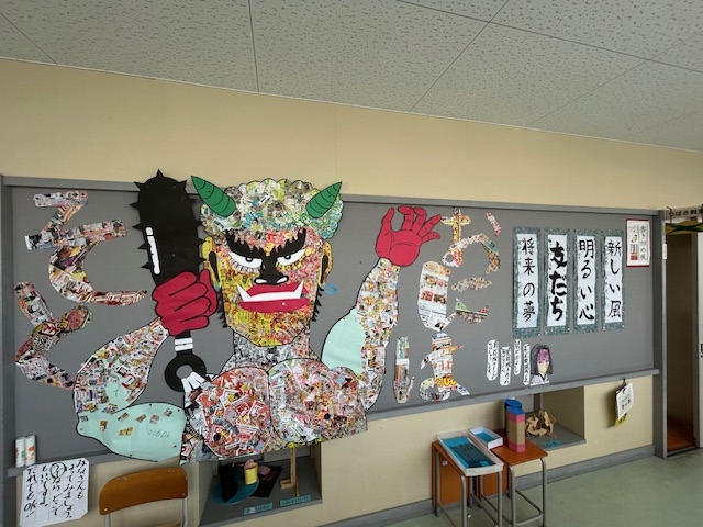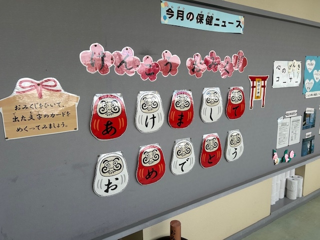 つばさ学級では、夏祭り、秋まつり、ハロウィン、節分などの季節感のある廊下掲示をしています。また、学習の足跡や仲間づくりにつながるように工夫した掲示を、全校のみんなへ紹介しています。保健室でも年中行事や季節に合わせて、健康や安全にかかわる掲示物をつくっています。掲示物の「堀津小神社」でおみくじをひくと「末吉:インフルエンザと戦う予感。毎日の手洗いうがいでようぼうしうよう。」と出ました。