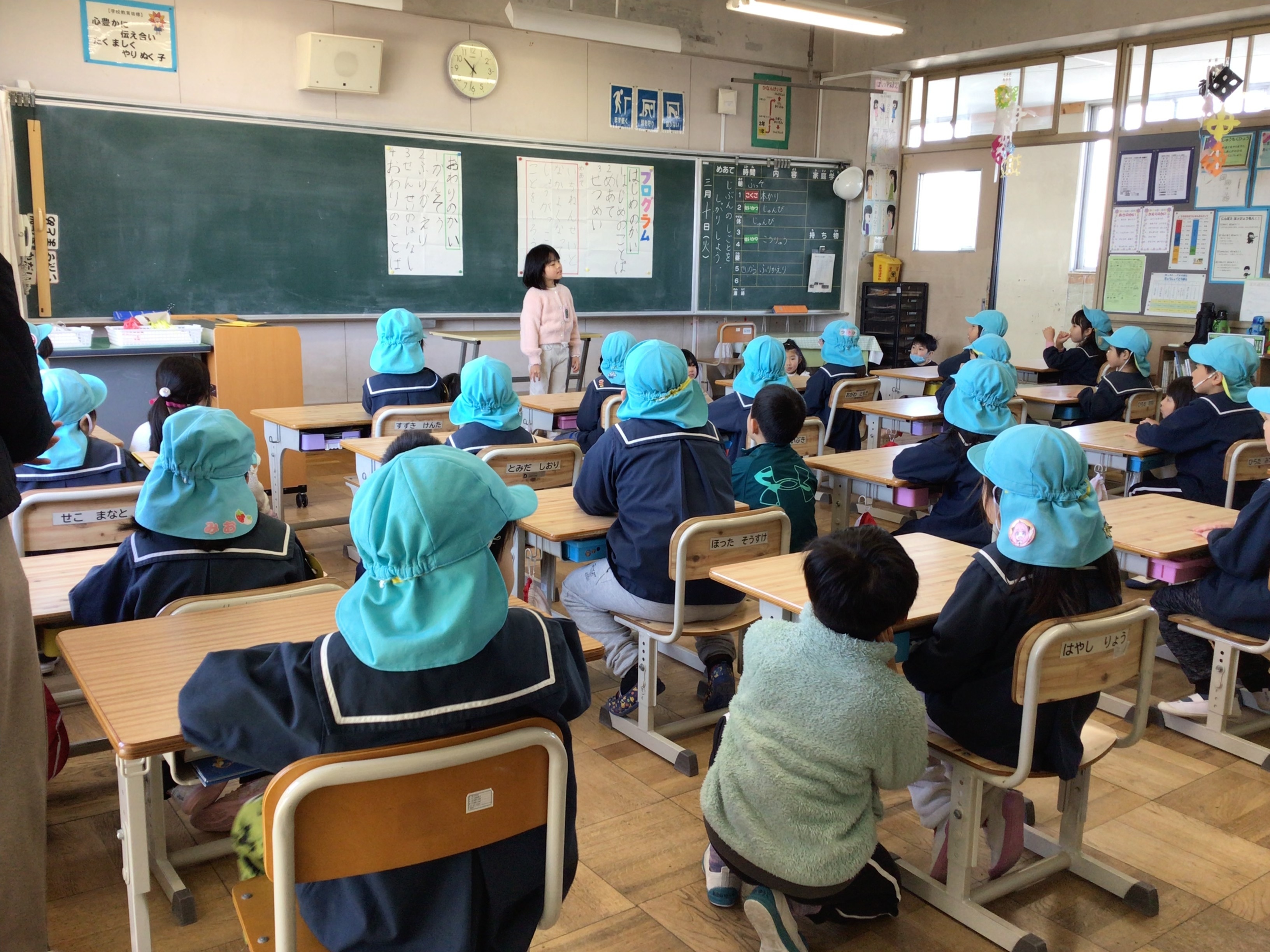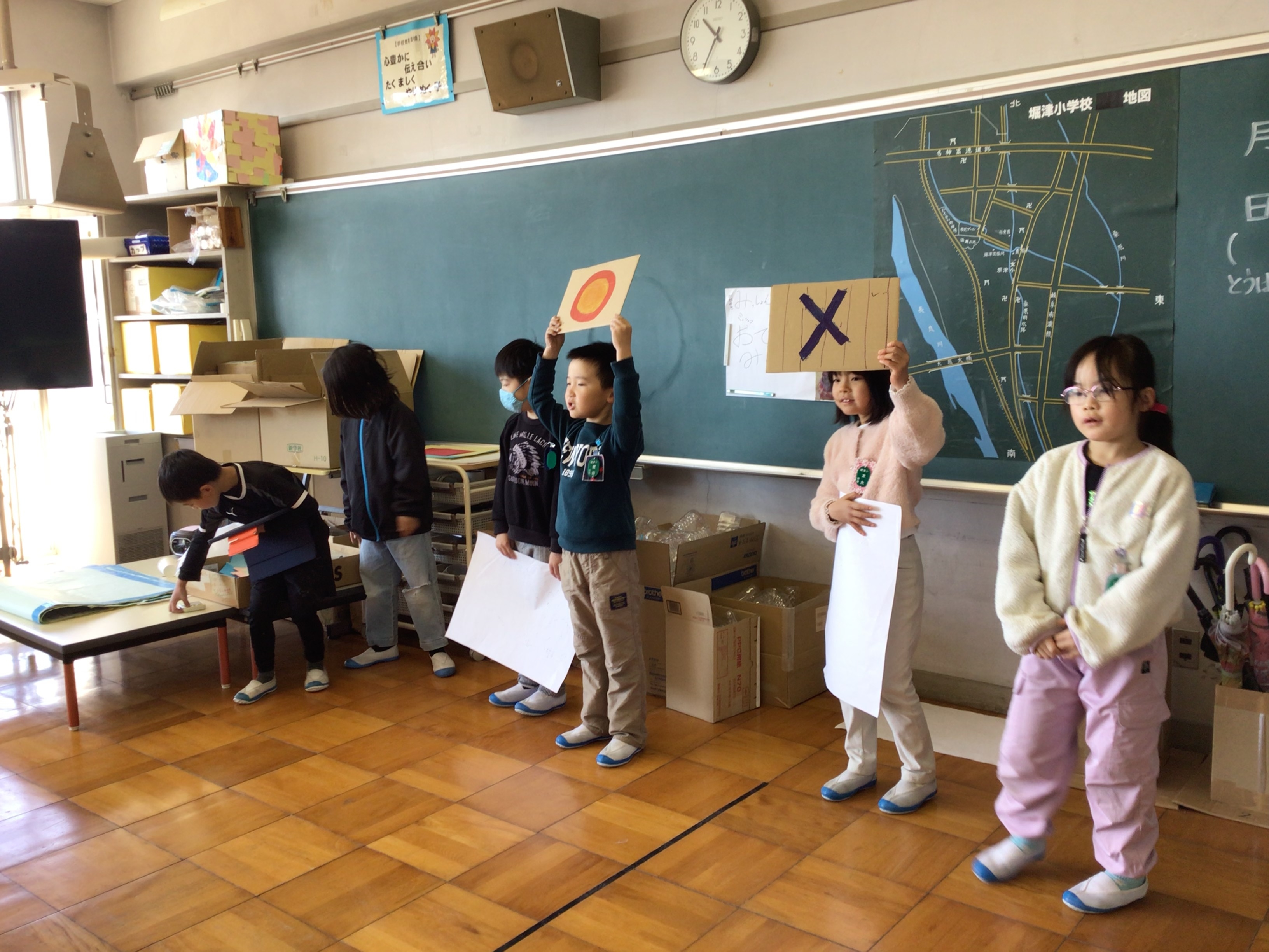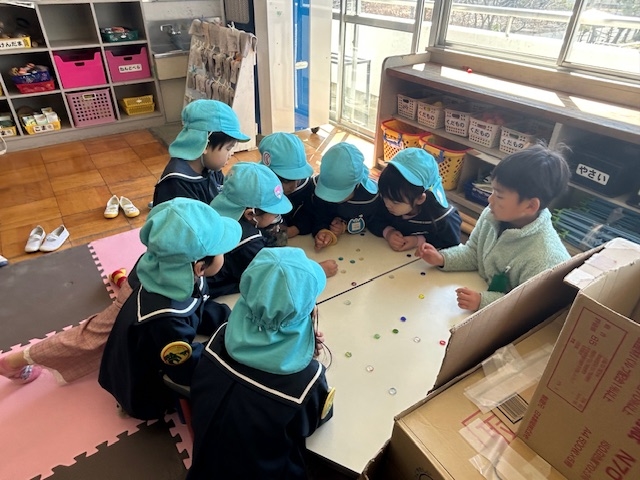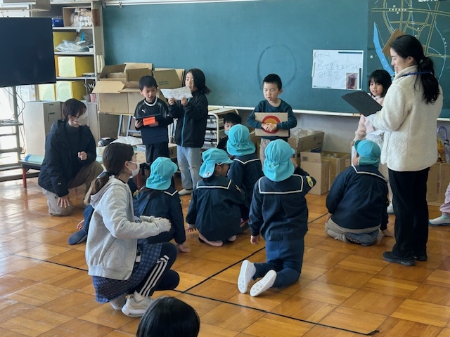 3月10日(火)、1年生が堀津保育園の子どもたちと交流しました。1年生は、グループに分かれて年長の子たちを図書館に案内したり、おはじき遊びやクイズ、輪投げなどで一緒に楽しんだりしました。1年生は年長さんへ図書館の本の紹介をしたり、ゲームの遊び方を教えたりと、1年間で成長した姿がたくさん見られました。