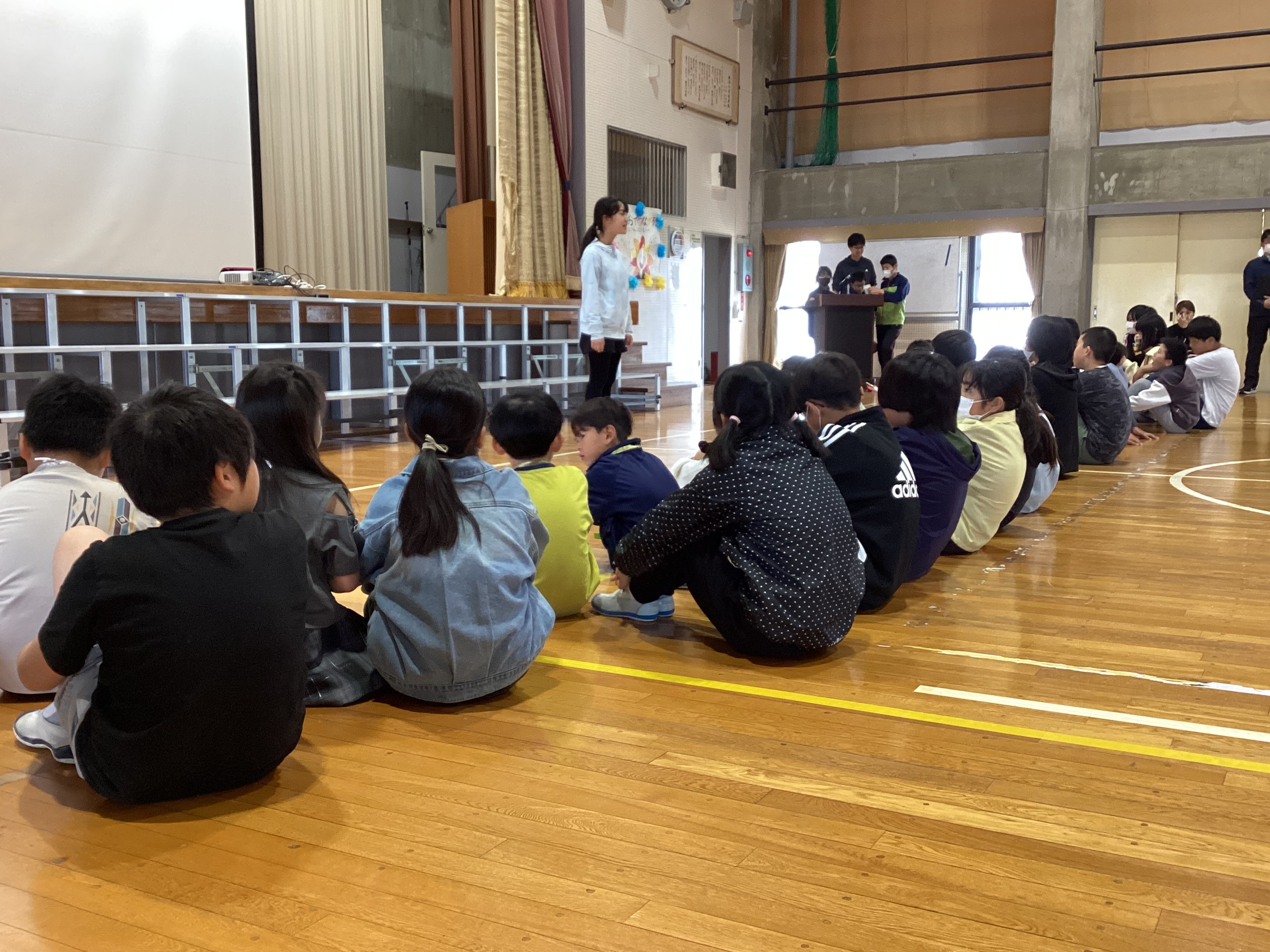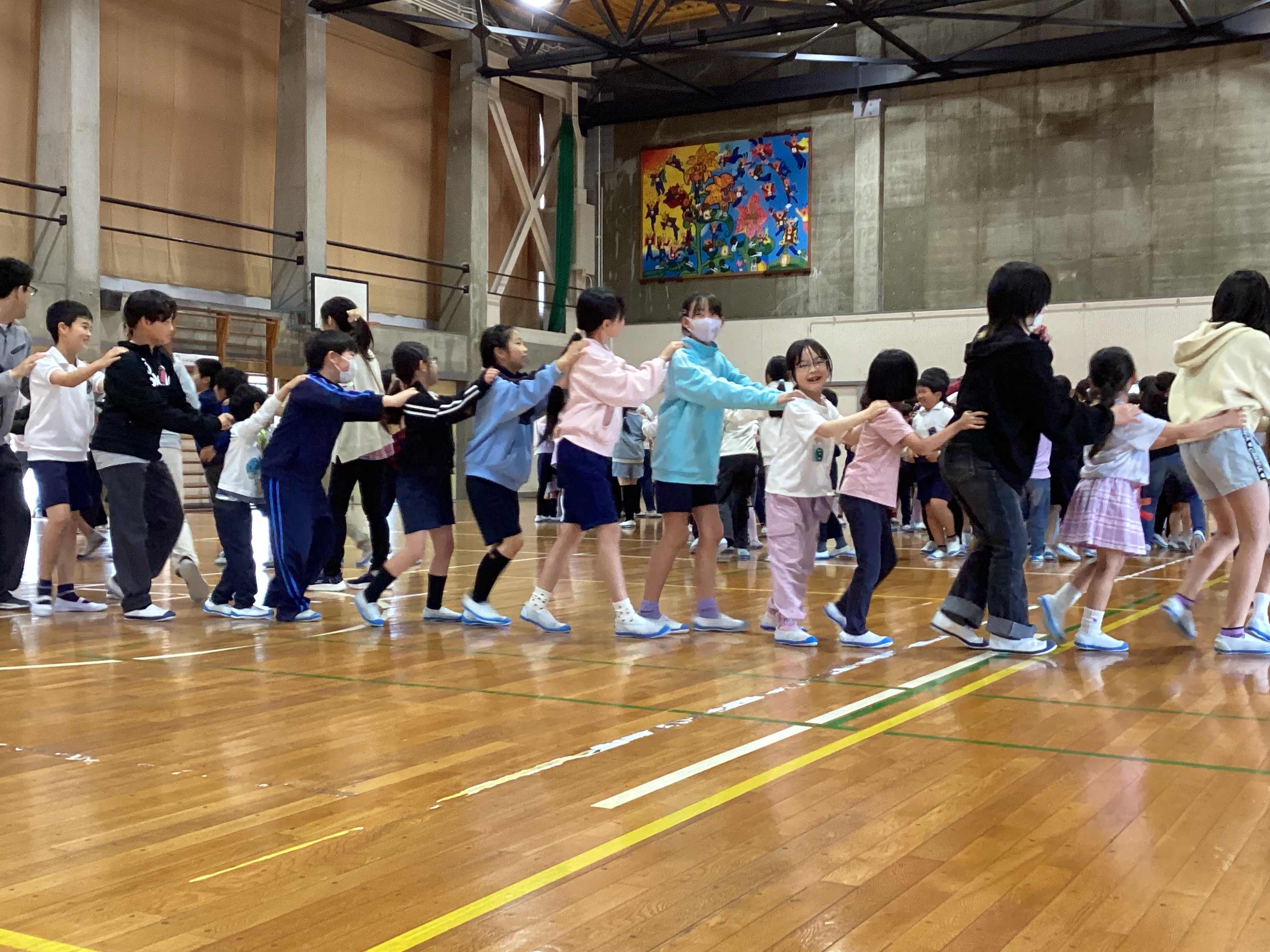 4月24日(金)、児童会活動「1年生を迎える会」を行いました。「えがおでつながろう~1年生といっしょにはずむ心~」をスローガンにして、全校みんなで「じゃんけん列車」や「もうじゅうがり」の楽しいなかよし遊びをしました。1年生は、おにいさんおねえさんと手をつないで、笑顔で活動することができました。2年生から6年生は、メダルづくり、会場の飾りつけ、司会や運営を担って、みんなが笑顔になって活動しました。最後に、全校みんなで校歌を歌ってしめくくりました。