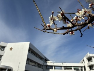 中島中学校に唯一ある梅の木の花がほころんでいます。